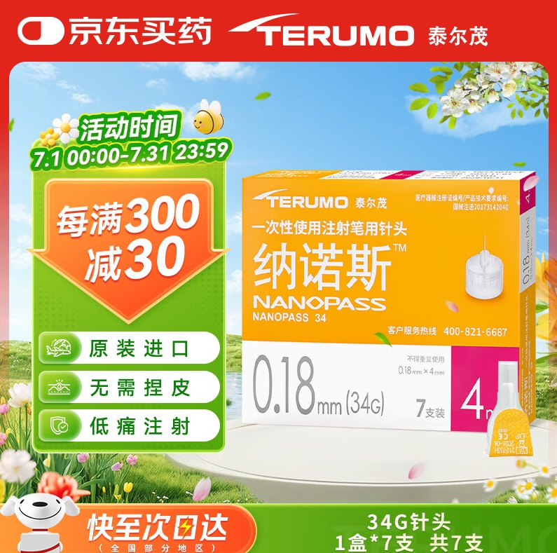 • 商品名称:泰尔茂(TERUMO)34G纳诺斯4mm一次性胰岛素针头司美注射针头 原装进口 7支/盒