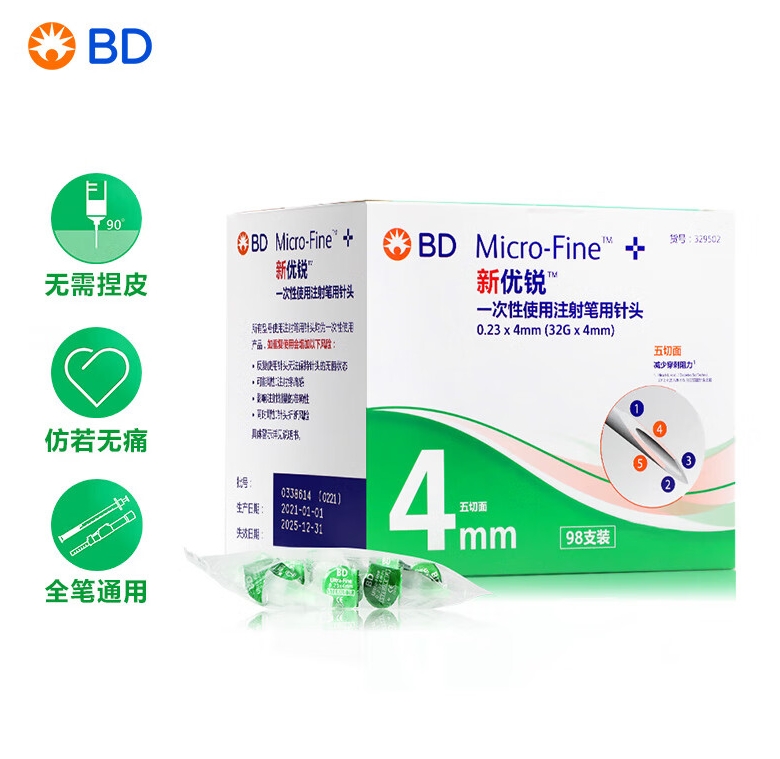 • 商品名称:新优锐BD针头胰岛素针头一次性使用注射笔用针头0.23(32G)*4mm 98支